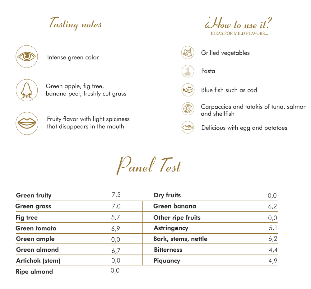 On the nose: “Verde Esmeralda” is fresh and intense, with notes of artichoke, freshly cut grass, tomato and green olive, evoking the freshness of the Andalusian land. In the mouth, the oil stands out for its intensity, with a strong, full-bodied flavor that envelops the palate. Its structure is rich and complex, with a perfect balance between sweetness and spiciness.