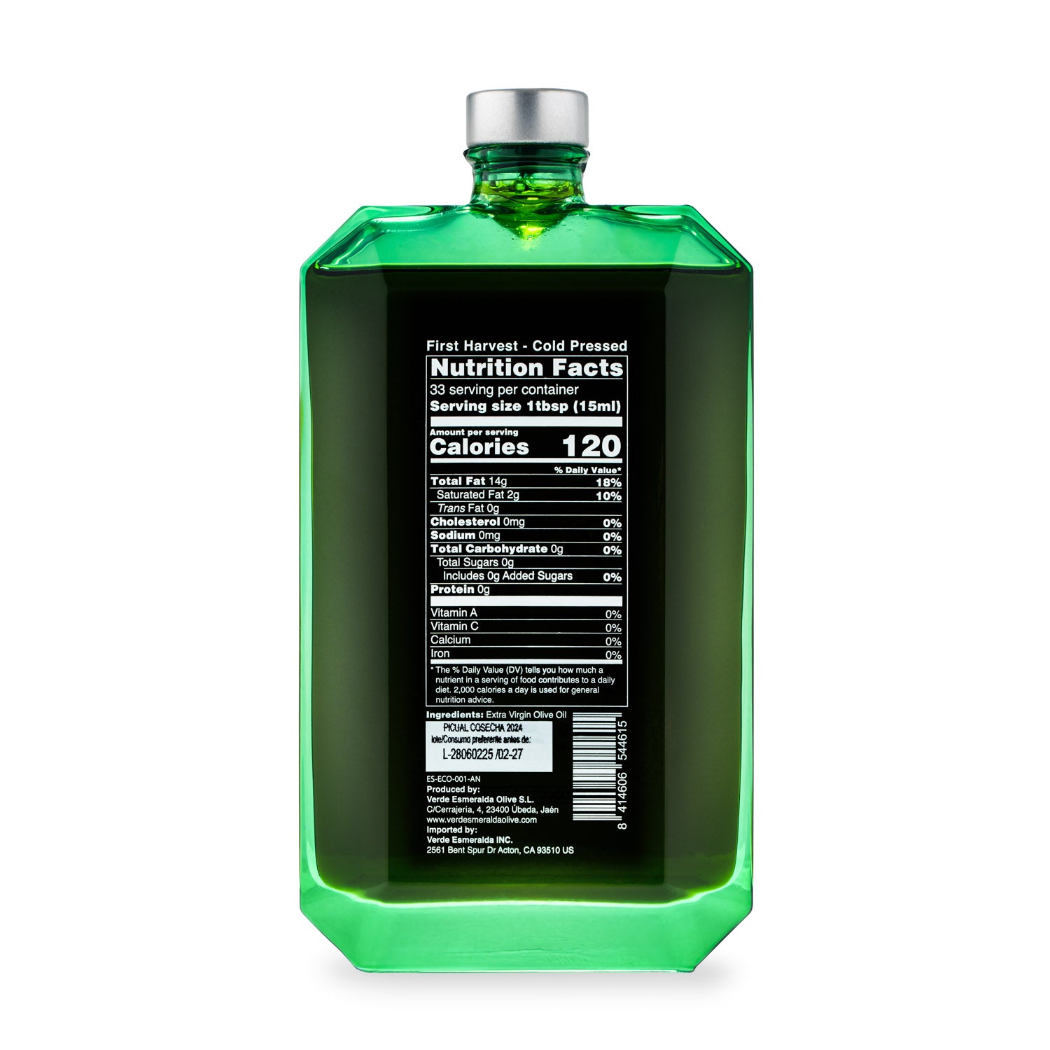 Verde Esmeralda' is our gourmet extra virgin olive oil from the 'Gems Line', made from the best olives of the Picual variety, one of the most appreciated for its intensity and complexity, grown in the prestigious region of Jaén, one of the most renowned in the world for the quality of its EVOO oil. This extra virgin olive oil Picual is a high-end product, obtained from a meticulous selection of the best olives, harvested and processed with great care in Andalusia. Traceable at all stages of the production process, it guarantees superior purity and quality. Its elegant packaging, reminiscent of the shape and color of a green gemstone, represents the emerald, a symbol of rarity and perfection, fully reflecting the luxury of this oil.